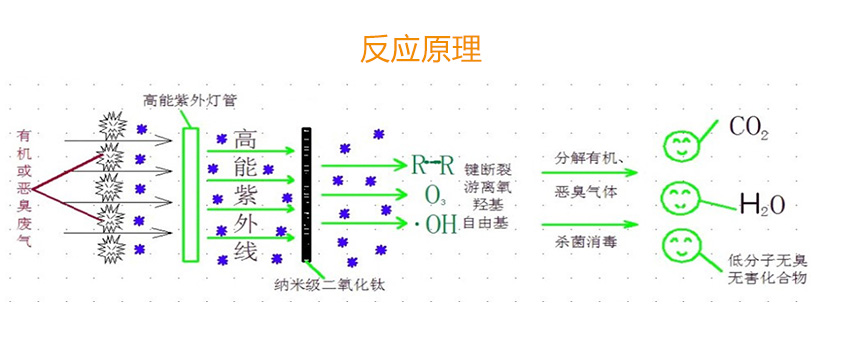 在Tio2光解催化氧化除臭設備內,高能紫外線光束與空氣、TiO2反應產生的臭氧、-OH (羥基自由基)對惡臭氣體(硫化氫、氨氣、硫醇)進行協同分解氧化反應,使惡臭氣體物質轉化為無臭味的小分子化合物或完全礦化,生成水和CO2,達標后經排風管排入大氣。