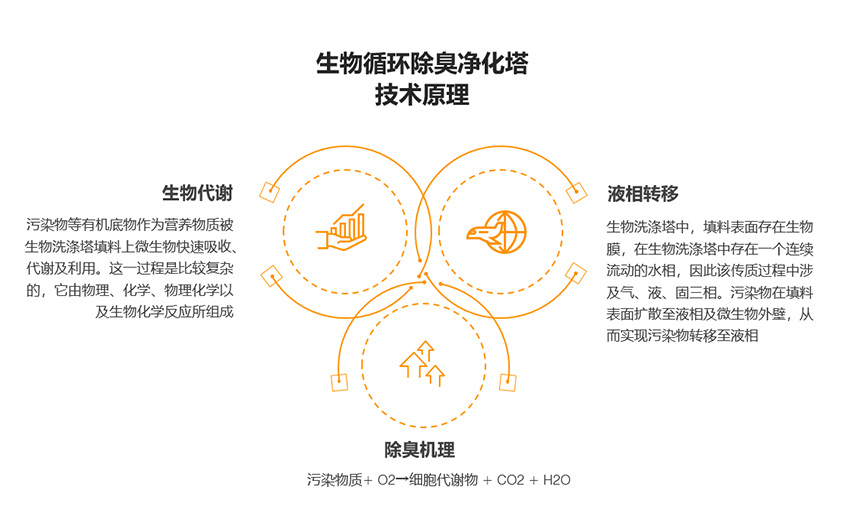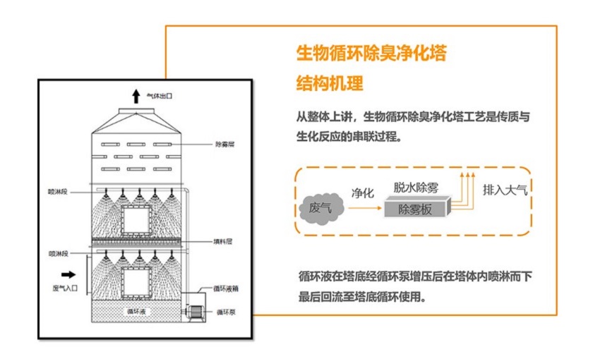 生物循環除臭凈化塔工藝是異味(惡臭)傳質過程與生化反應的串聯過程。