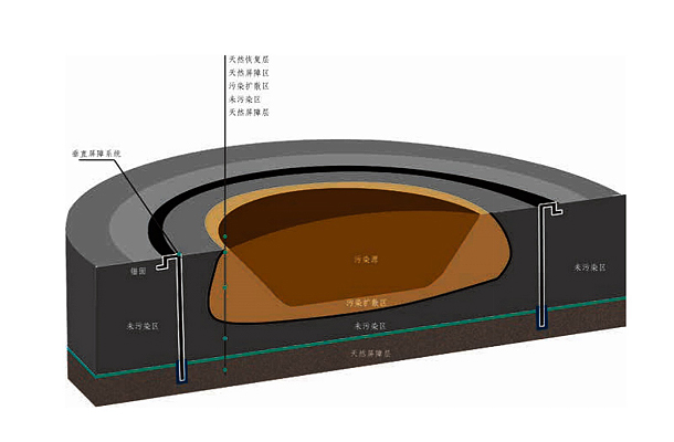 垂直防滲技術(shù)主要利用場地底部存在的不滲水層或弱透水層,將垂直密封層構(gòu)筑其上,以達到將污染物控制于場地之內(nèi)的目的,同時也有阻止周圍地下水流入場地的功能。