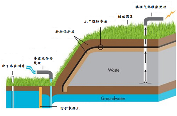 填埋場封場技術(shù)是指通過工程手段,將不再使用的固廢填埋場隔離成一個封閉獨立的單元,外界雨水和地下水不再進入堆體,堆體內(nèi)產(chǎn)生的廢水和廢氣等污染物進行有序?qū)藕吞幚恚固盥駡霾辉傥廴局苓叚h(huán)境。