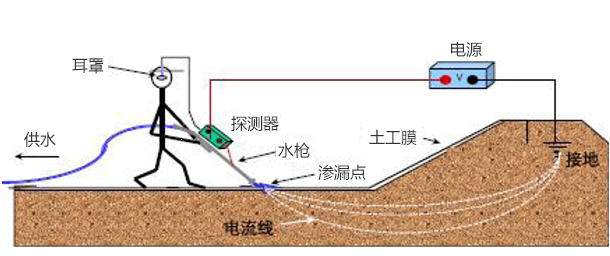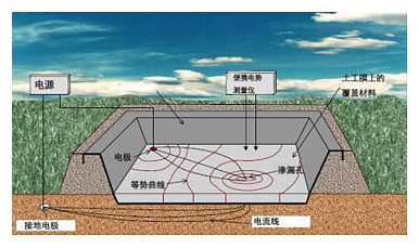 在雙電極土工電學滲漏破損探測方法中,將不同電勢施加到土工膜(泥土或水)上面及其下面。覆蓋土工膜的泥土或水的電勢場相對均勻。土工膜為一種極其有效的絕緣體,在存在孔洞時電場導通,通過移動測量儀探測導通位置,精確定位產(chǎn)生滲漏孔洞的點。